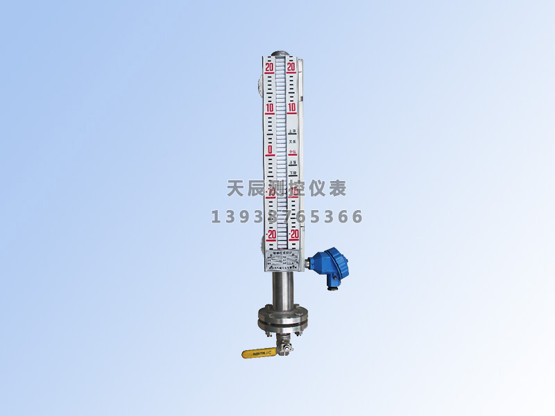 UHM—FⅢ远传型磁翻板液位计,它是在普通型的侧面加装了远传变送器,该远传型磁翻板液位计是由主体管、磁浮子、传感器、变送器和磁柱指示器五部分组成。其工作原理是以主体管内的磁浮子随液位的升降而同时吸合传感器内相应位置上的干簧管,从而使传感器内的总电阻(或电压)发生相应的变化,然后通过变送器将电阻的变化转换成4~20mA标准电流信号输出,并通过显示仪表或微机来实现对容器内液面的远距离显示或连续PID调节。