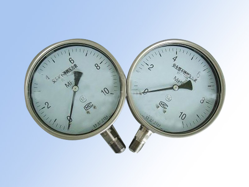 全不锈钢安全型压力表顶部设有充液塞及一个内部补偿膜片,可在现场充液。充液型安全压力表具有耐震和阻尼性能,可以防止因震动对压力表内部的损伤,同时还可润滑内部元件,减少腐蚀。